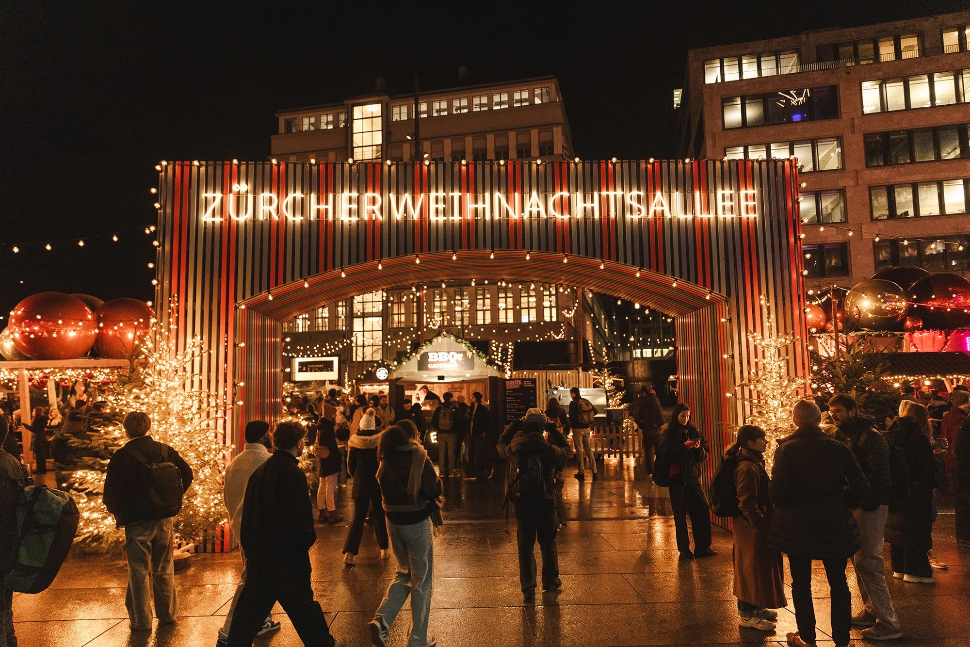 Glühwein-Spot mit DJ am Abend, am Europaplatz, direkt beim Zürich Hauptbahnhof und inmitten der Zürcher Weihnachtsallee.